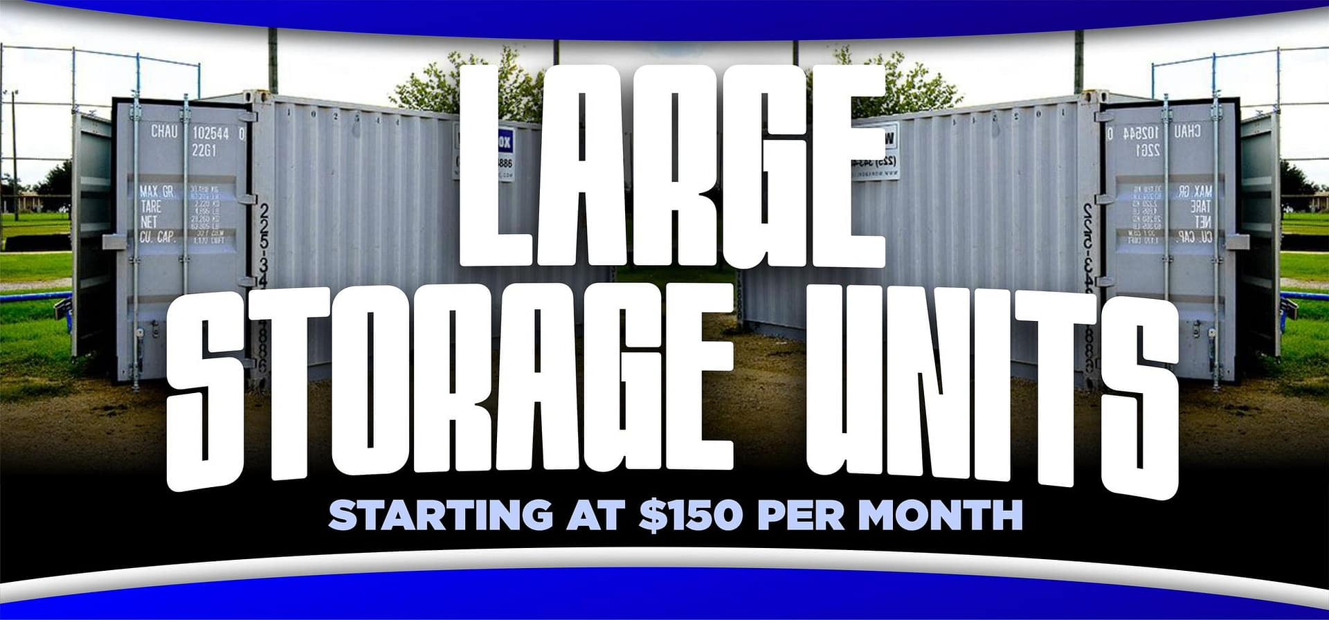 All Units are (10 x 20 x 8). Rate is $150 per/month. These large containers are spaces are about the size of a one-car garage and can fit the contents of a three to five bedroom house, from bed frames, mattresses and sofas to large appliances like a washer and dryer, refrigerator and stove. This is also a great space to store lots and lots…and lots of boxes.